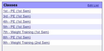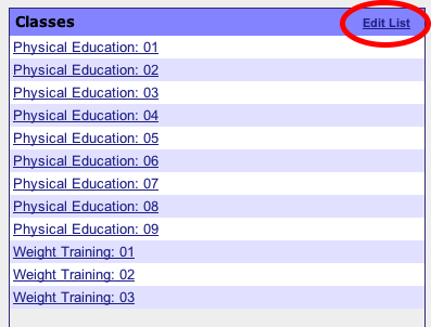 Your Classes are listed by name and section number by default. You will need to change or update the name to include period, and semester information. Click the Edit List link to begin.