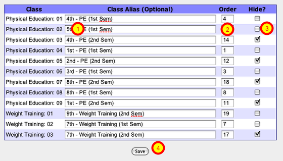 1 - In the Class Alias box, you can rename the class to include Period and Semester or anything else that helps you tell your classes apart. For example, I would rename the first class listed in the screenshot to 4th Period PE - 1st Sem.