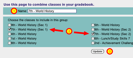 This teacher officially has two sections of World History 7th period, with one section being mainstreamed intervention students. However, since all students will be in 7th period together, it maybe easier if these two classes were combined for the gradebook.