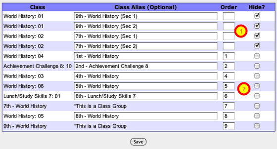 By using Class Aliases, Ordering and hiding the classes window is much clearer. At the beginning of 2nd semester, this teacher will need to change the hiding choices to show their 2nd semester classes.